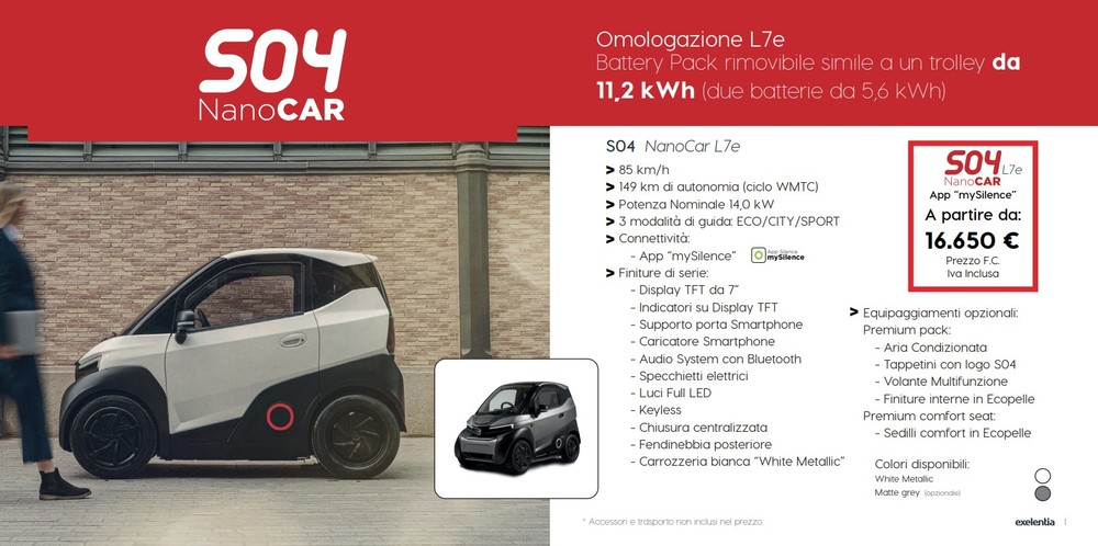 A partir de 2024, o S04 também pode ser encomendado sem o pacote Premium e com o novo pacote que inclui bancos em couro ecológico. Na Itália, Silence S04 é distribuído pela Exelentia. Este modelo é compatível com o status de Ecobônus. Todos os preços incluem IVA, excluindo custos de registo, transporte rodoviário e entrega.