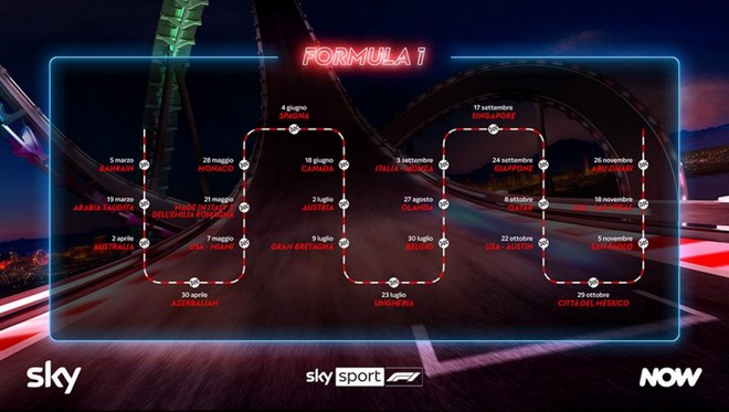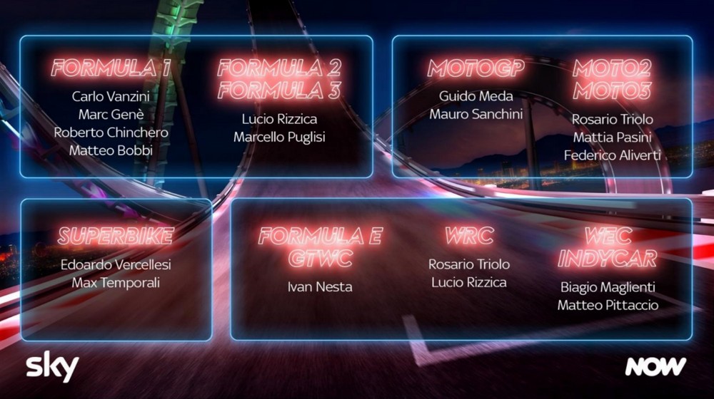 A não perder como sempre Anatomia de uma corrida de F1 conduzida por Fabio TavelliCada corrida será narrada por Carlo Vanzini com Marc Geni e Roberto Chinchero. Federica Masolin será a pioneira pré e pós-corrida com Davide Valsecchi, e depois disso haverá intrusões de Nico Rosberg, insights técnicos de Matteo Bobbi na sala Sky Sport Tech, entrevistas de Mara Sangiorgio e comentários de Ivan Capelli.
