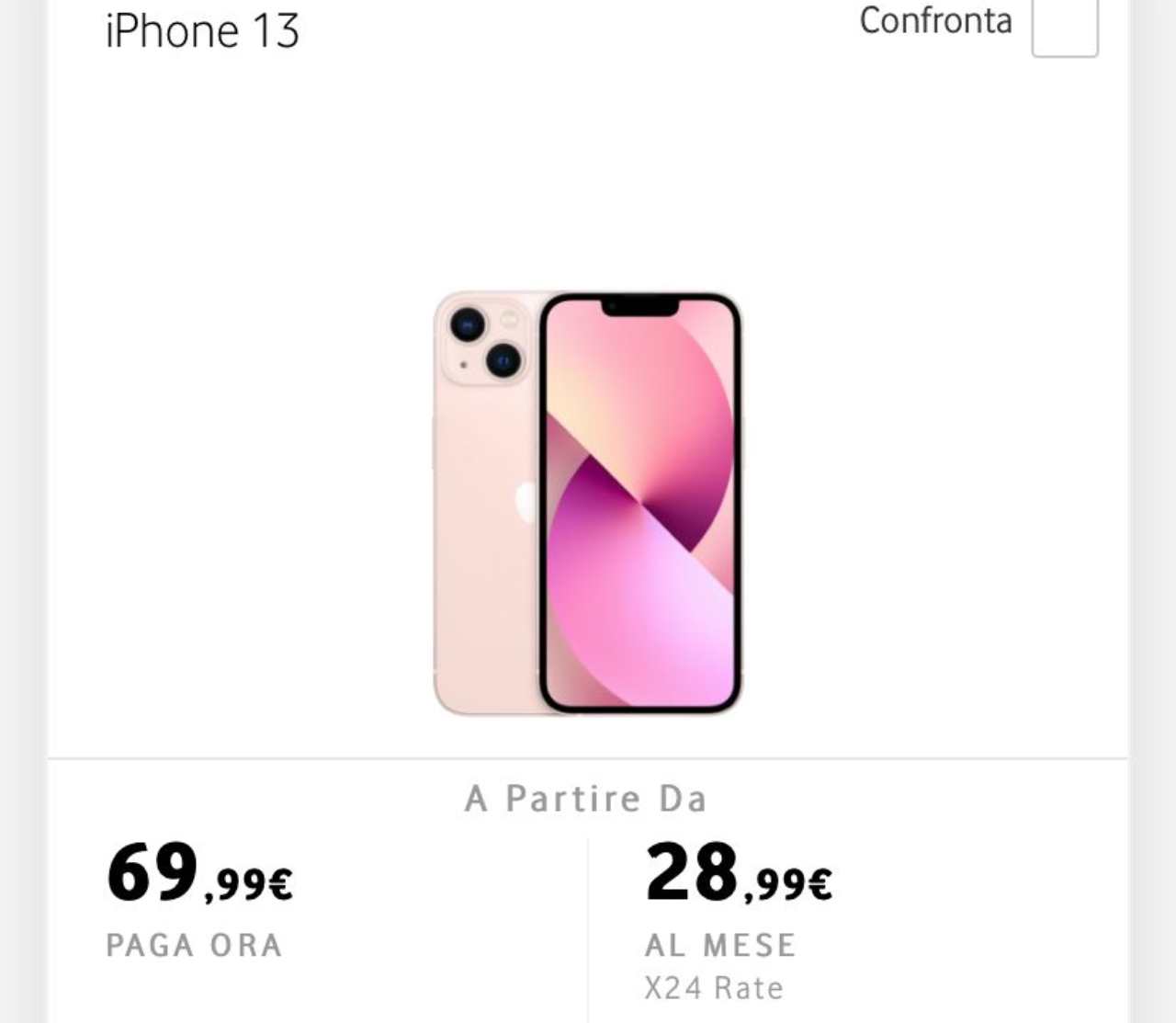 De fato, dando uma olhada rápida no site oficial, você pode ver tanto o iPhone 13 quanto aquele vanguarda, que pode estar em condições um pouco mais altas do que as condições de base. De fato, neste caso, o adiantamento será de 69,99 euros e 39,99 euros Plano A diferença mensal é sempre 24 meses. Mas não para por aí, porque a lista é realmente extensa.